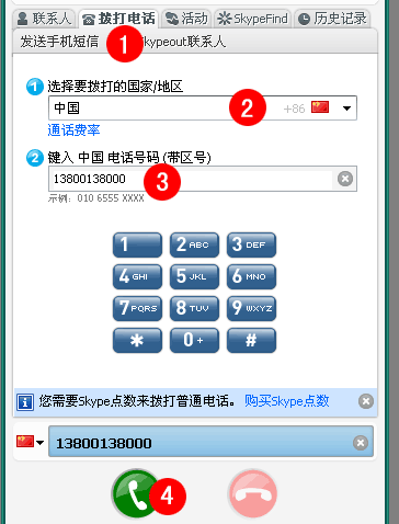 撥打電話:在Skype的撥號界面中輸入中國的國家代碼(+86),接著是電話號碼。核對無誤後,點擊撥打按鈕以開始通話。